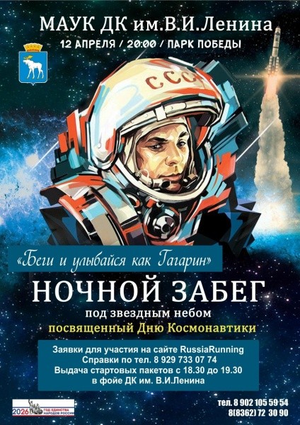 12 апреля с 20:00 до 21:00 в Парке Победы Йошкар-Олы пройдет ежегодный ночной легкоатлетический забег «Беги и улыбайся как Гагарин», посвященный Дню космонавтики и Году народного единства.