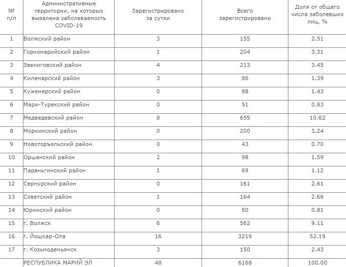 «Чистыми» от коронавируса за сутки остались Куженерский, Мари-Турекский, Моркинский, Новоторъяльский, Сернурский, Юринский районы.