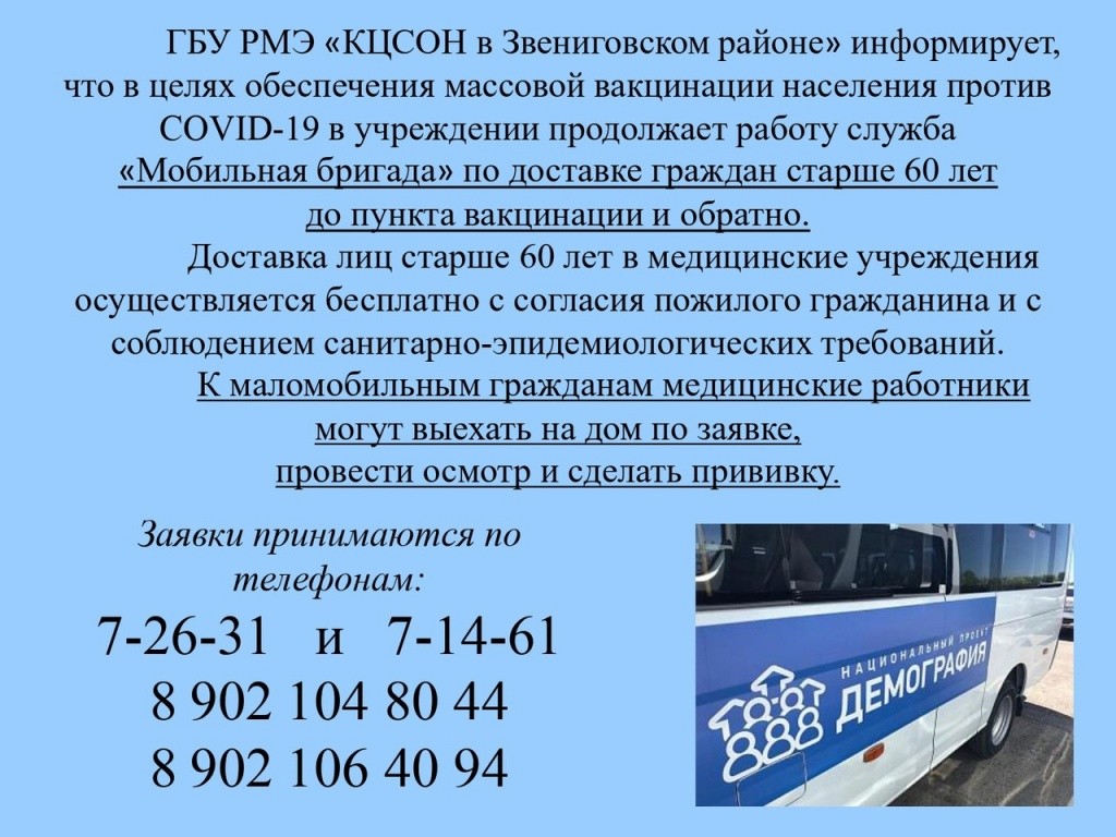 В администрации Звениговского района Марий Эл напомнили об удобном «сервисе» для пожилых людей, желающих привиться от коронавируса. Теперь их до пункта вакцинации доставит «Мобильная бригада».