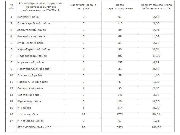 По данным Управления Роспотребнадзора по Марий Эл, большинство (18) новых подтвержденных случаев коронавирусной инфекции выявлено в Йошкар-Оле. в 6 случая COVID-19 подтвердился в Медведевском районе, по 1 случаю выявлено за сутки в городе Волжске и Сернурском районе. Остальные муниципальные образования республики остались «чистыми» от новых случаев коронавируса.