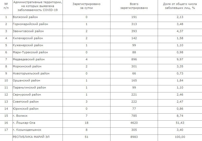 «Чистыми» от коронавирусной инфекции за стуки остались Волжский, Мари-Турекский, Новоторъяльский и Юринский районы.