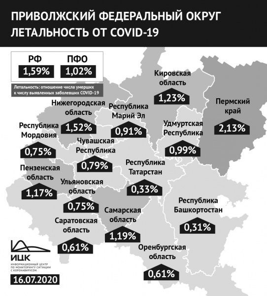 По данным Информационного центра по мониторингу ситуации с коронавирусом на 16 июля, в Марий Эл показатель летальности от COVID-19 составляет 0,91%. Он ниже среднероссийского показателя (1,59 %) и среднего значения по Приволжскому федеральному округу (1,02%).