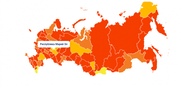 Помимо Марий Эл в жёлтой зоне оказались Тыва и Дагестан. К сожалению, на данный момент в других регионах уровень заболеваемости остаётся высоким.