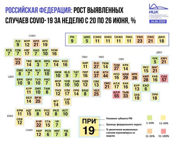 По данным Информационного центра по мониторингу ситуации с коронавирусом, за неделю, с 20 по 26 июня, рост выявленных случаев COVID-19 в Марий Эл составил 9%. Такой показатель, от 1% до 10%, относит Марийскую республику к регионам с наиболее низким приростом заболевших коронавирусом (зеленая зона - см. иллюстрацию).
