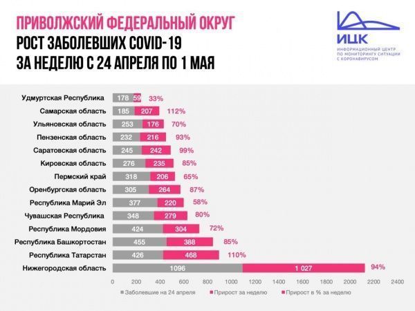 Самое большое количество человек заразились за неделю в Нижегородской области. Здесь коронавирус подтвержден у 1027 больных, прирост составил 94%.