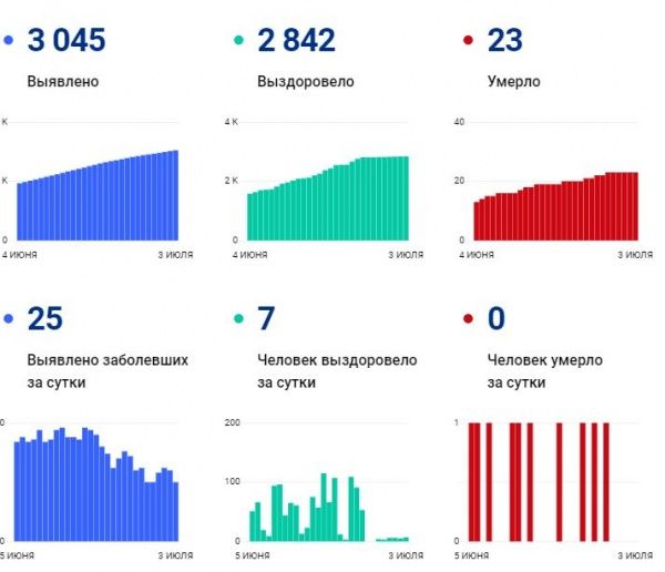 По данным сайта стопкоронавирус.рф на 3 июля, в Марий Эл за сутки зарегистрировано 25 новых случаев заболевания COVID-19, семеро выздоровели. Всего с начала пандемии в Марийской республике выявлено 3 045 случаев заболевания коронавирусной инфекцией, выздоровели 2 842 человека, скончались 23 пациента с подтвержденным диагнозом COVID-19.