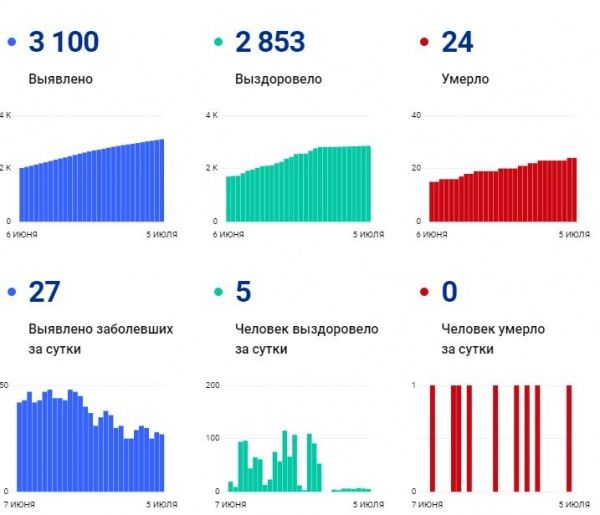 По данным сайта стопкоронавирус.рф, на утро 5 июля в Марий Эл зарегистрировано 27 новых случаев заболевания коронавирусной инфекцией, пять человек выздоровели. Всего с начала наблюдений в Марий Эл выявлено 3 100 случаев заболевания коронавирусной инфекцией, выздоровели 2 853 человека, умерли 24 пациента с подтвержденным диагнозом COVID-19.