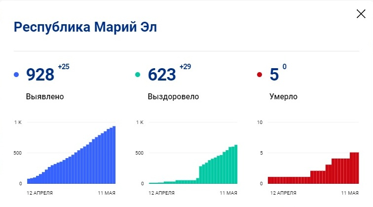 По данным сайта стопкоронавирус.рф на 11 мая, за сутки в Марий Эл подтверждено 25 новых случаев заражения COVID-19. Таким образом, всего с начала пандемии в регионе зарегистрировано 928 больных коронавирусом, умерли 5 человек.