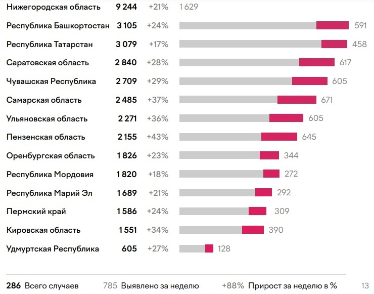 За неделю подтверждено 7556 новых случаев — прирост на 26%. Максимальный прирост отмечается в Пензенской и Самарской областях (на 43% и 37% соответственно). Наименьший — в республиках Татарстан (на 17%) и Мордовия (на 18%). В абсолютных показателях по приросту выявленных заболевших по-прежнему лидирует Нижегородская область — 1629 новых случаев за неделю, на втором месте идет Самарская область, где выявлен 671 новый случай. По Марий Эл показатели распределились так: максимальный прирост составил 21%, выявленных заболевших за неделю – 292, всего случаев зарегистрировано 1689.