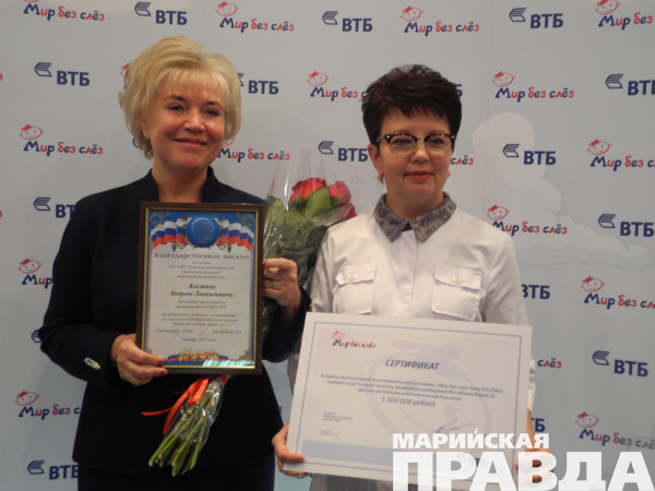 А вот у взрослых в этот день был еще один повод для радости. На состоявшейся после представления пресс-конференции директор Йошкар-Олинского офиса ВТБ Галина Мокшина вручила главному врачу Республиканской детской больницы Татьяне Бастраковой сертификат на 1,5 млн рублей на приобретение оборудования для отделения реабилитации.