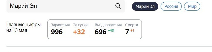 По данным Яндекса, на 12 мая, за сутки в Марий Эл подтверждено еще 32 новых случаев заражения COVID-19. Таким образом, всего с начала пандемии в республике зарегистрировано 996 больных коронавирусом. Всего с начала эпидемии умерли 7 человек.