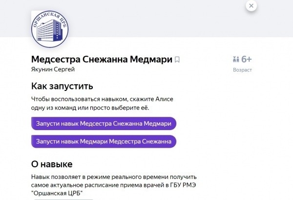 Чат-боты и навык в голосовом помощнике Яндекс Алиса «Медсестра Снежана» расскажут об актуальном графике работы врачей не только взрослой, но и детской поликлиники Оршанской ЦРБ.