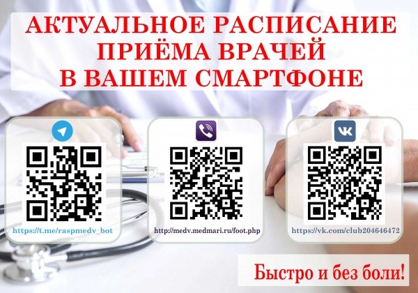 Теперь с внедрением нового сервиса пациенты поликлиники Медведевской ЦРБ всегда будут знать самое свежее расписание работы любого врача. Причем не только из информации на мониторе в холле поликлиники, но и в своем смартфоне.