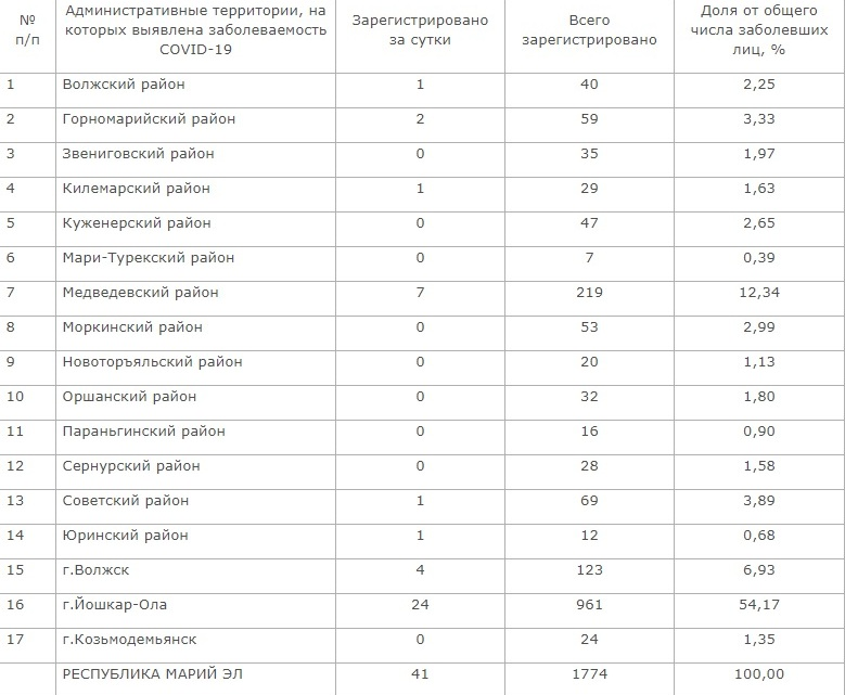 На 31 мая в Йошкар-Оле зарегистрировано наибольшее количество заболевших коронавирусом – 24 человека. 7 человек заболели в Медведевском районе, 4 – в Волжске, 2 в Горномарийском районе и по одному – в Волжском, Килемарском, Советском и Юринском районах. Об этом сообщили в пресс-службе Управления Роспотребнадзора по Марий Эл.