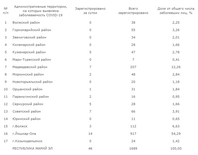 Также по данным Роспотребнадзора по Марий Эл, всего с начала эпидемии в республике зафиксировано 1643 случая инфицирования коронавирусной инфекцией. При этом средний прирост за неделю составил 2,7 процента. Среди всех выявленных инфицированных 25% - бессимптомные носители, у 42% болезнь протекает в легкой форме, у 28,7% - в средней степени тяжести, 3,9 % - в тяжелой форме. Летальность составляет 0,6 %, в России – 0,9 %. В количестве инфицированных 60% приходится близкие контакты. Кроме того, на сегодня 137 завозных случаев, что составляет 8% от всех зарегистрированных инфицированных.
