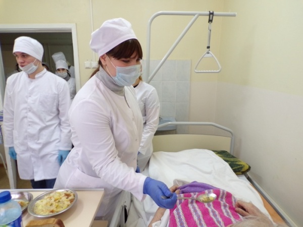 Затем волонтеры сами приняли участие в уходе за пациентами. Под руководством медсестер ребята проводили гигиеническую обработку пациентов, включающую подмывание и мытьё пациентов, смену памперсов, стрижку и бритьё. Будущие фельдшеры меняли постельное белье, помогали перевязывать и кормить пациентов.