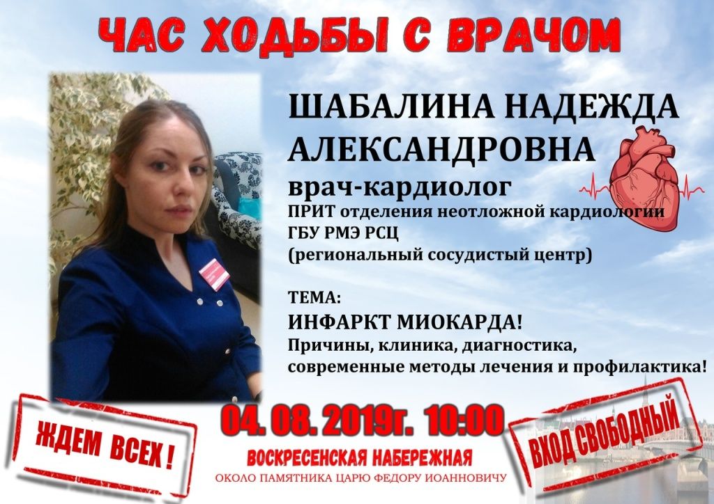Полезное и познавательное мероприятие начнется с 10.00 на Воскресенской набережной около памятника царю Федору Иоанновичу. На вопросы участников ответит Надежда Шабалина − врач-кардиолог палаты реанимации и интенсивной терапии (ПРИТ) отделения неотложной кардиологии.