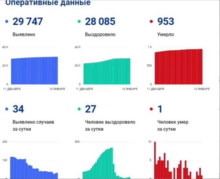 Всего с начала пандемии в Марий Эл лабораторно подтверждены 29 747 случаев заболевания коронавирусом. Выздоровели 28 085 человек, в том числе 27 – за минувшие сутки. Новый коронавирус унес жизни 953 человек. За сутки было выявлено 34 новых случаев заражения. По данным на 6 января, уровень коллективного иммунитета достиг 61,84%.