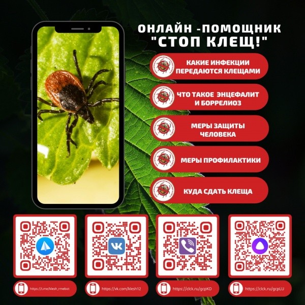 Центром гигиены и эпидемиологии в Республике Марий Эл для профилактики болезней, передающихся клещами, запущены чат-боты и голосовой помощник «Стоп клещ!». Получить ответ на интересующие вопросы можно в мессенджерах Telegram, Viber, социальной сети ВКонтакте и голосовом помощнике Яндекс Алиса.
