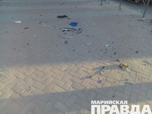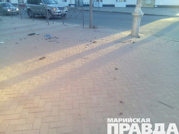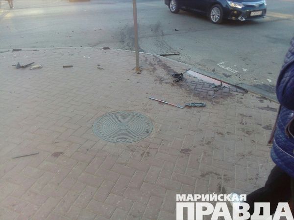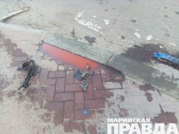 - На перекрестке бульвара Чавайна с улицей Советской марийской столицы сегодня произошло ДТП. На брусчатке еще не высохла лужа 'крови", а рядом лежат мелкие осколки фар и бампера. Очевидцы утверждают, что вылетевший на тротуар автомобиль сбил пешехода. Судя по следам от протекторов на проезжей части, водитель начал торможение, но остановить машину до столкновения не успел, - комментирует читатель Сергей фотографии, присланные с места ЧП.