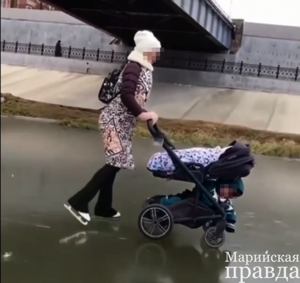 Пользователи соцсетей обсуждают видео, выложенное в Сеть жительницей Йошкар-Олы, которая встала на коньки и прокатила по льду Малой Кокшаги в столице Марий Эл двух малышей в коляске.