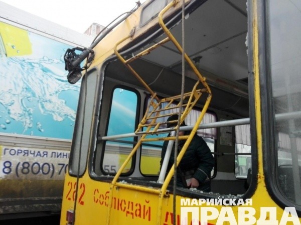 Новыми подробностями о сегодняшнем ДТП с участием двух троллейбусов в Йошкар-Оле поделилась читательница портала marpravda.ru Наталья Воронина, приславшая новые фото и видео с места происшествия. На помощь пострадавшим приезжала карета скорой помощи, а лобовое стекло у одного из троллейбусов разбито.