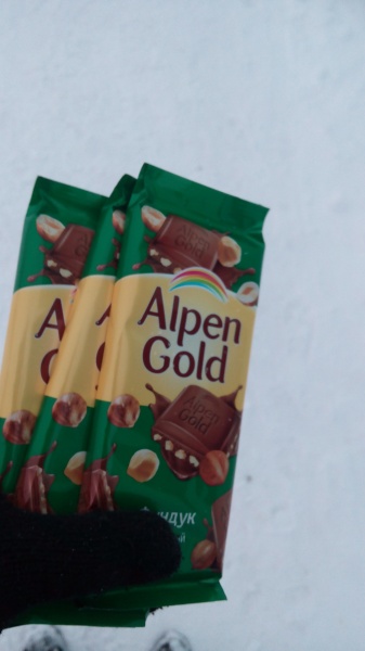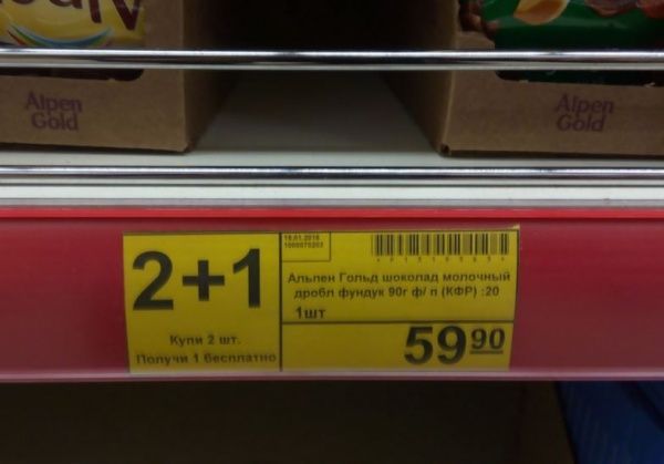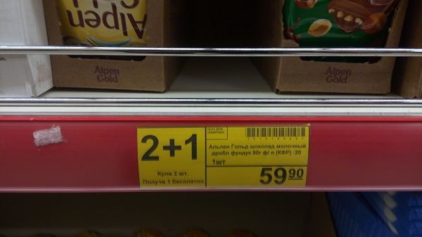 Действие происходило в городе Волжске, в гипермаркете (название и адрес удалены. ред.), в первой половине дня. Когда я прогуливался по магазину, в глаза бросился шоколад "Альпен гольд" с дробленным фундуком. Хотя не столько шоколад привлек внимания, сколько яркий желтый ценник "2+1. Купи 2 шт., получи 1 бесплатно".