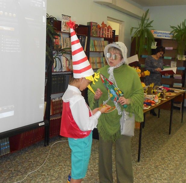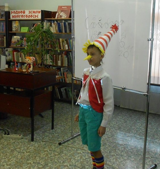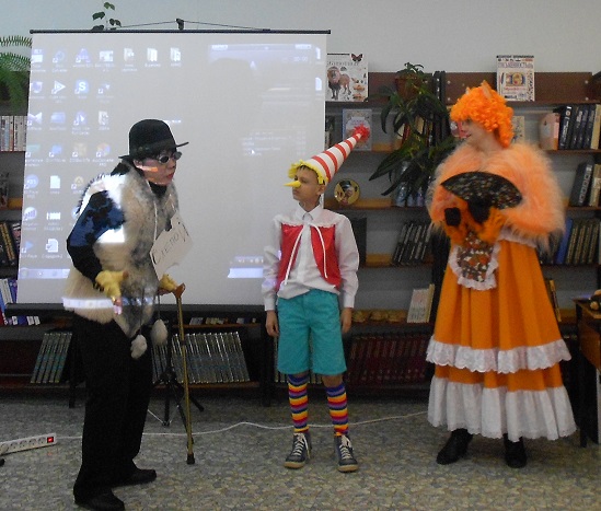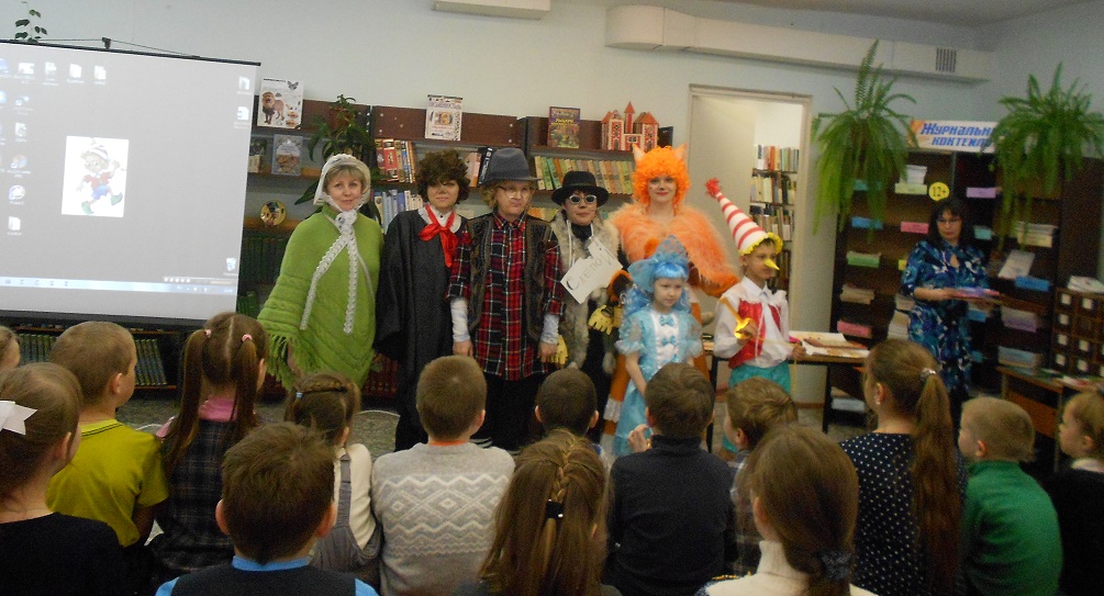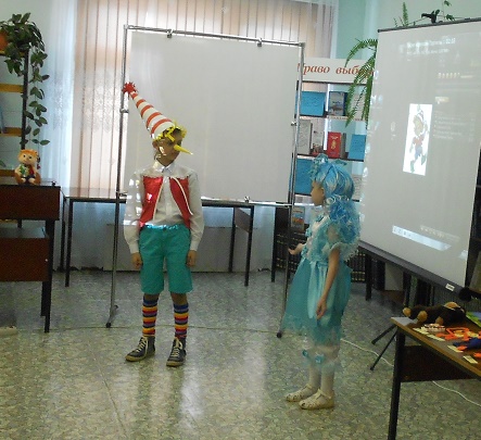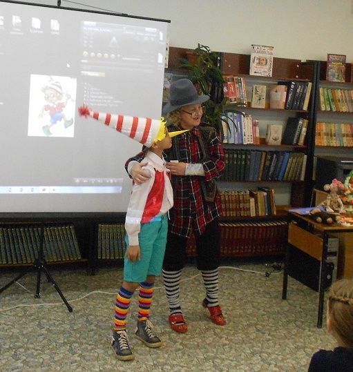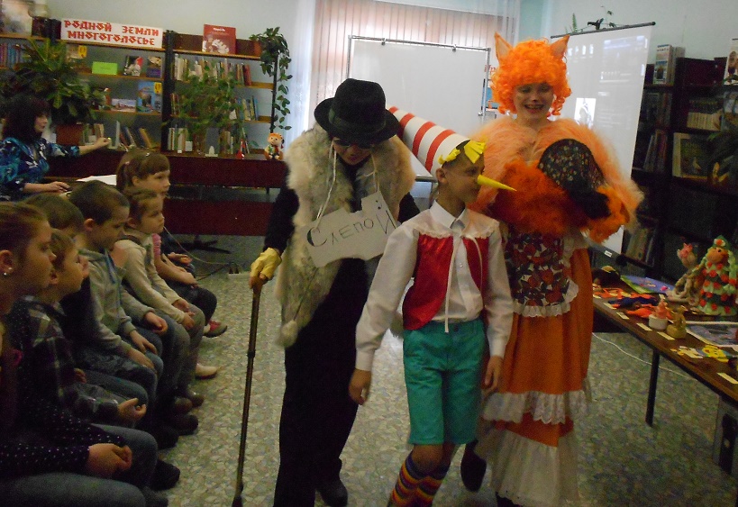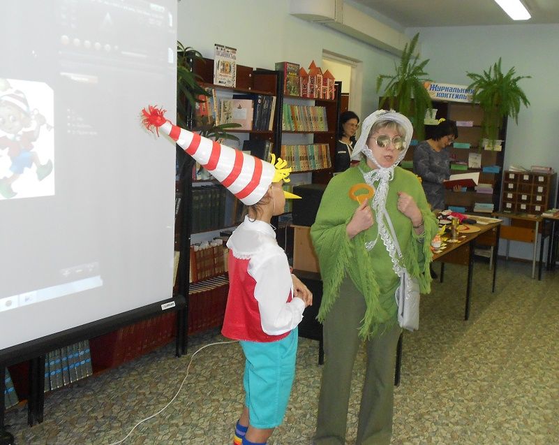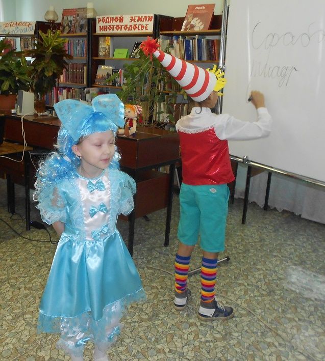 На имя нашей библиотеки пришла посылка, в ней были задания и конкурсы, отгадав которые, дети смогли попасть в волшебный театр. Задания были рассчитаны так, чтобы в конкурсах могли участвовали все гости праздника. Выполнив их, дети попадают в волшебный мир сказки «Золотой ключик». Там они познакомились с проказником Буратино, с хитрой Лисой Алисой и слепым Котом Базилио. Как ловко они обманули наивного Буратино и увели его в Страну Дураков.