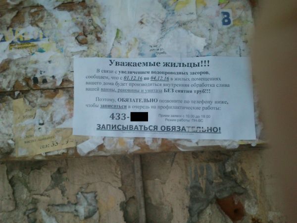 Они лучше родного домоуправления, да что там, лучше самих жильцов знают, что в доме "увеличилось количество водопроводных засоров" и безапелляционно уведомляют с 1 по 4 они будут обрабатывать сливы ванной, раковины и унитаза... Обязательно запишитесь... Записываться обязательно... И да - у них же "очередь на работы".