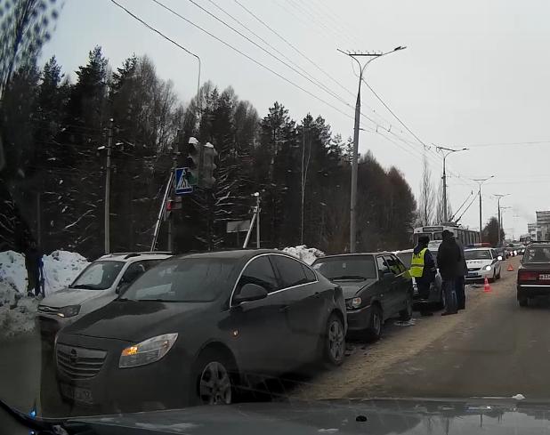 Опель, судя по всему притормозивший у перехода догнала ВАЗ-2115, а ее в свою очередь догнала серебристая иномарка, так же не успевшая остановиться в виду короткой дистанции перед впереди идущим автомобилем. Жертв судя по всему нет, сообщает наш читатель Сергей Кононов с места происшествия и приславший видео в рубрику "Мобильный репортер", однако владельцам предстоит увлекательное общение с представителями страховых компаний и автосервисами.