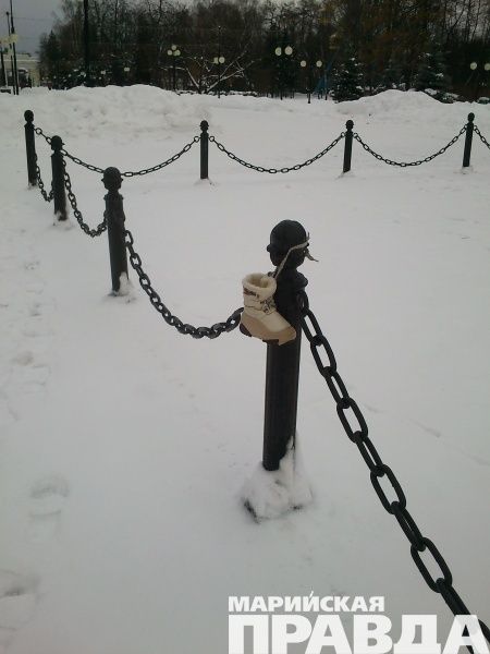 Наутро 1 января редкие прохожие в Центральном парке Йошкар-Олы могли видеть как на одном из столбиков ограждения Вечного огня висел потеряный детский сапог. Снимок с находкой прислал в рубрику "Мобильный репортер" Виктор Герасимов. Скорее всего кто-то так весело встречал новый год, что не заметил как его ребенок пришел домой в одном сапоге.