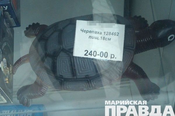- Эта милая черепашка с витрины меня очень позабавила. Наверное, 128462 – это какой-то инвентарный номер, но смотрится как имя. Прямо черепашка с цифровым именем. Умиляет также слово «пищ.», которое можно понять, как то, что черепаха пищит. Или она пищевая. Или ей самой нужна пища. И, наконец, уточнение размера – 18. См. – прямо как у мебели. Мол, если кто-то собрался покупать черепашку, то можно сразу прикинуть в какой угол ее лучше поставить, поместится ли между диваном и шкафом. Ну, не знаю, может быть, кому-то это покажется не смешным, но мне было весело. Спасибо работникам киоска за поднятое настроение! – пишет Светлана.
