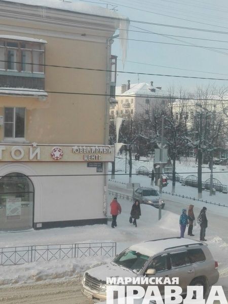 На фото, присланном читателем, видно, что на углу дома №128 свисают несколько ледяных наростов, один больше другого, а внизу под ними идет не подозревающие об опасности прохожие. Людей в этом месте марийской столицы всегда много, ведь перекресток улиц Советской и бульвара Чавайна – это очень оживленное место.