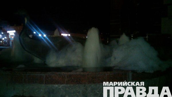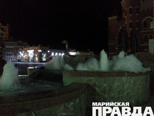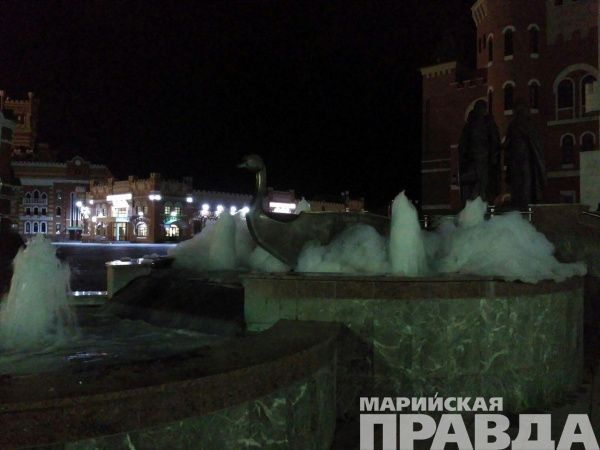 В Йошкар-Оле фонтан у памятника Петру и Февронии на Патриаршей площади ночью покрылся горами белой пены. Об этом порталу marpravda.ru сообщил читатель Максим, прислав фото с места.