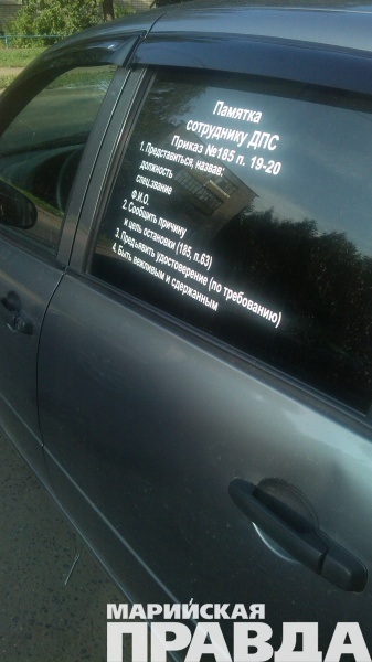 В Йошкар-Оле водители печатают «шпаргалки» для полицейских на стеклах своих автомобилей, чтобы помочь слугам закона вспомнить правила обращения с автолюбителями. Об этом сообщил порталу marpravda.ru читатель Максим, приславший фото.