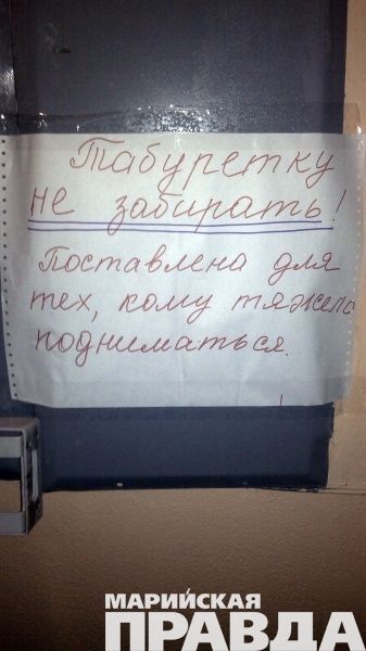 - Спасибо тем людям, которые догадались поставить табурет в первом подъезде на 4-м этаже дома на улице Воинов-Интернационалистов, 22. Дело в том, что в доме меняют лифты, а людям со слабым здоровьем, вроде меня, очень тяжело подняться, скажем, на восьмой этаж без перерыва. Когда я, запыхавшись от долгого подъема, увидела табурет, это было просто маленьким счастьем. Передохнула и спокойно пошла дальше. А для того, чтобы табурет никто не убрал, рядом даже есть объявление, в котором сказано: «Табуретку не забирать! Поставлено для тех, кому тяжело подниматься». Еще раз спасибо этим людям за заботу! – рассказала йошкаролинка Ираида Васнецова.