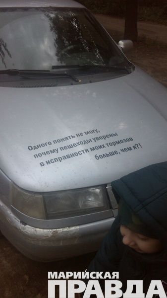 -  На капоте одного из автомобилей в Йошкар-Оле красуется интересная надпись. Водитель, вероятно, написал свои мысли по поводу пешеходов, которые считают, что машина способна остановиться мгновенно или уверены, что автомобиль не трамвай  - объедет. Водитель пишет, что не понимает, почему пешеходы уверены в тормозах его автомобиля больше, чем он сам. Молодец! Вроде и с юмором надпись, и пешеходов не оскорбляет, и задуматься заставляет! – пишет Максим.