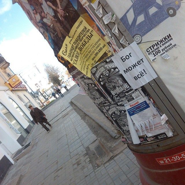 Эту афишную тумбу Валентин увидел и сфотографировал 5 мая в Йошкар-Оле, на улице Советской. Забавно, что рядом с различными объявлениями об акциях и услугах, кто-то разместил необычное объявление: «Бог может все!». Жаль, телефон на этом объявлении не указан, шутит Валентин. А то бы отбоя от желающих воспользоваться услугами не было.