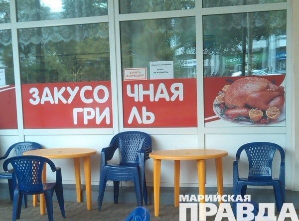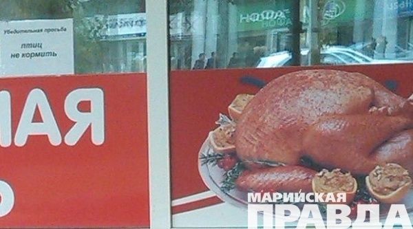 Объявление «Убедительная просьба: птиц не кормить» висит рядом с аппетитным изображением жареной курицы на витрине закусочной недалеко от центрального рынка Йошкар-Олы. Неужели кто-то набирается так, что лезет кормить нарисованную тушку на витрине или пичкает готовый гриль его же собственным мясом?