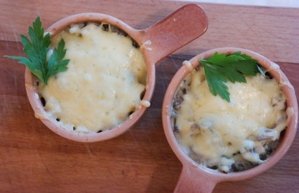 Смешайте соус с грибами и курицей, посолите, поперчите и тушите на небольшом огне 3-4 минуты. Разогрейте духовку, натрите сыр. Разложите массу по отдельным небольшим кокотницам и щедро посыпьте сыром. Поставьте кокотницы в духовку на 15-20 минут при температуре 180 градусов, пока сыр не запечется до корочки.