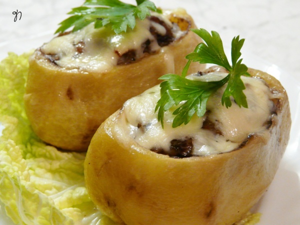 3. Полученный фарш положить в картофель, а сверху накрыть той же картофельной «шляпкой».