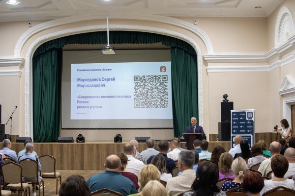 Перед аудиторией темой лекции «Современная внешняя политика России: вызовы и угрозы» выступил лектор Общества «Знание», российский политолог, кандидат исторических наук, ведущий научный сотрудник Института международных исследований МГИМО МИД России Сергей Маркедонов. Эксперт разобрал ключевые тенденции в международных отношениях, стратегические приоритеты России и актуальные геополитические риски.