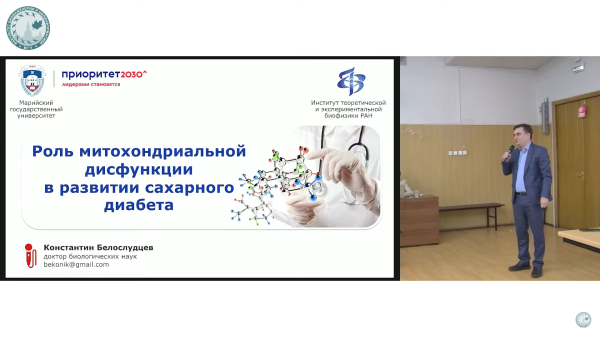Научная школа биомедицины Марийского государственного университета была представлена проректором по инновационной деятельности МарГУ – д.б.н. Константином Николаевичем Белослудцевым, который выступил с лекцией «Роль митохондриальной дисфункции в развитии сахарного диабета».
