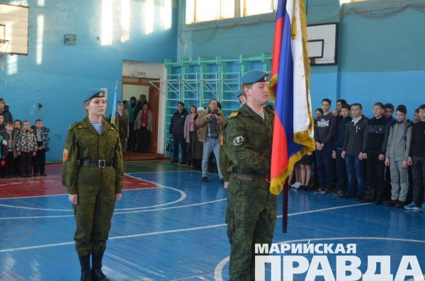 Руководитель военно-патриотического клуба «Заря» при радиомеханическом техникуме Йошкар-Олы Юрий Пурынычев передал триколор знаменной группе кадетов поселковой школы №1. Произошло это во время районного конкурса патриотической песни.