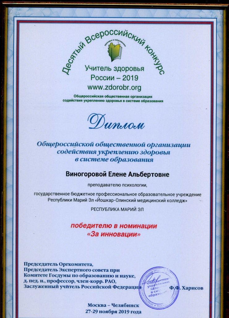 Преподаватель психологии Йошкар-Олинского медицинского колледжа Елена Виногорова стала победителем X Всероссийского конкурса «Учитель здоровья-2019» в номинации «Инновации в образовании».