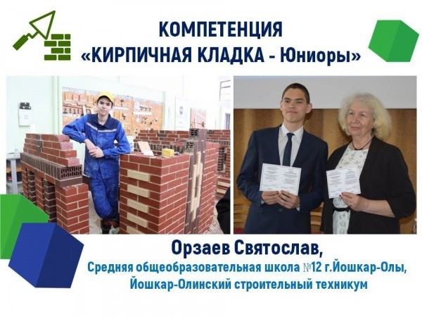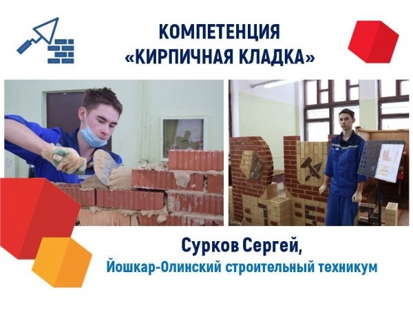 Марий Эл на Национальном чемпионате представят Сергей Сурков из Йошкар-Олинского строительного техникума по компетенции «Кирпичная кладка», Святослав Орзаев (СОШ №12 Йошкар-Олы) - «Кирпичная кладка – Юниоры», Иван Пайгатов и Максим Михайлов (Красноярская СОШ) - «Электромонтаж - Юниоры».