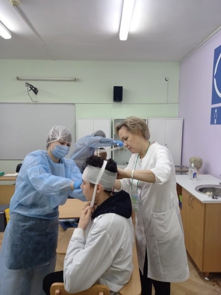 И здесь же, в медколледже, девять обучающихся из 23-й школы под руководством педагога-наставника Соколовой Н.А. отработали технику наложения повязок на голову. У ребят получились красивые и грамотно наложенные повязки!