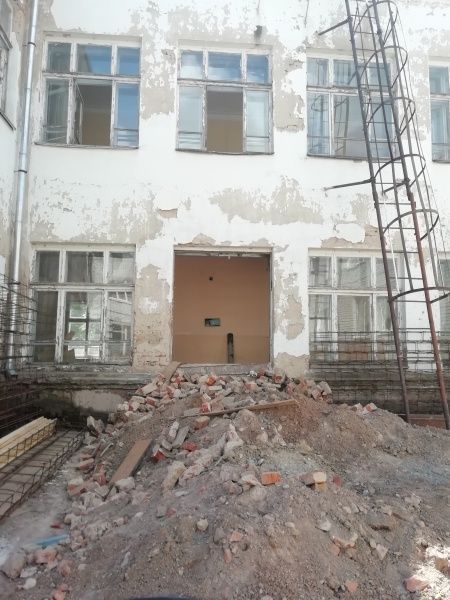 Даже перекрытий между первым и вторым этажом в старом корпусе нет. Всё демонтировано. Проект, по словам специалистов, серьёзный, ремонтировать старое зачастую сложнее, чем строить новое.