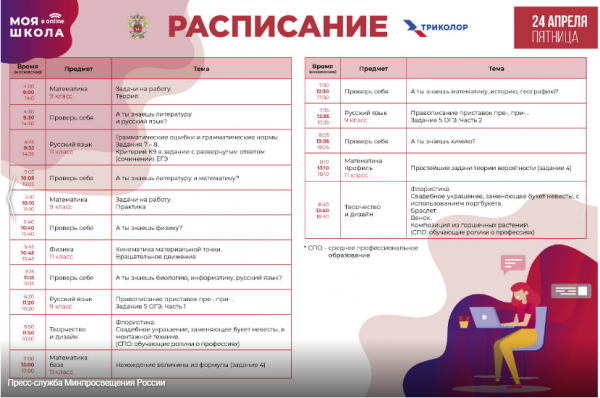 Расписание трансляций будет публиковаться в специальном разделе на сайте Министерства просвещения, в социальных сетях и на портале «Российская электронная школа».