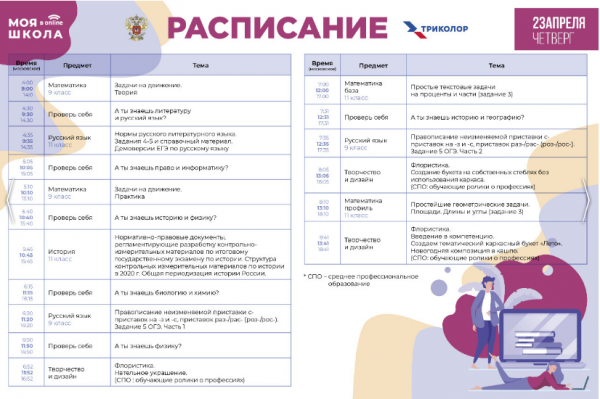 Образовательные часы будут проводиться в будние дни с 9 и до 12 часов. Длительность уроков по пол часа.22 апреля, в день старта в "Триколор" прошло 8 уроков, включая профориентационные видеозанятия с повторами в разных часовых поясах для комфорта и удобства учащихся вне зависимости от места проживания обучающихся, сообщается на сайте Минпросвещения РФ.